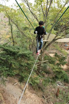 8〜13mくらいの高さに紐を張って、その上を渡るようなのが基本の、大人版アスレチックのようなものです。
